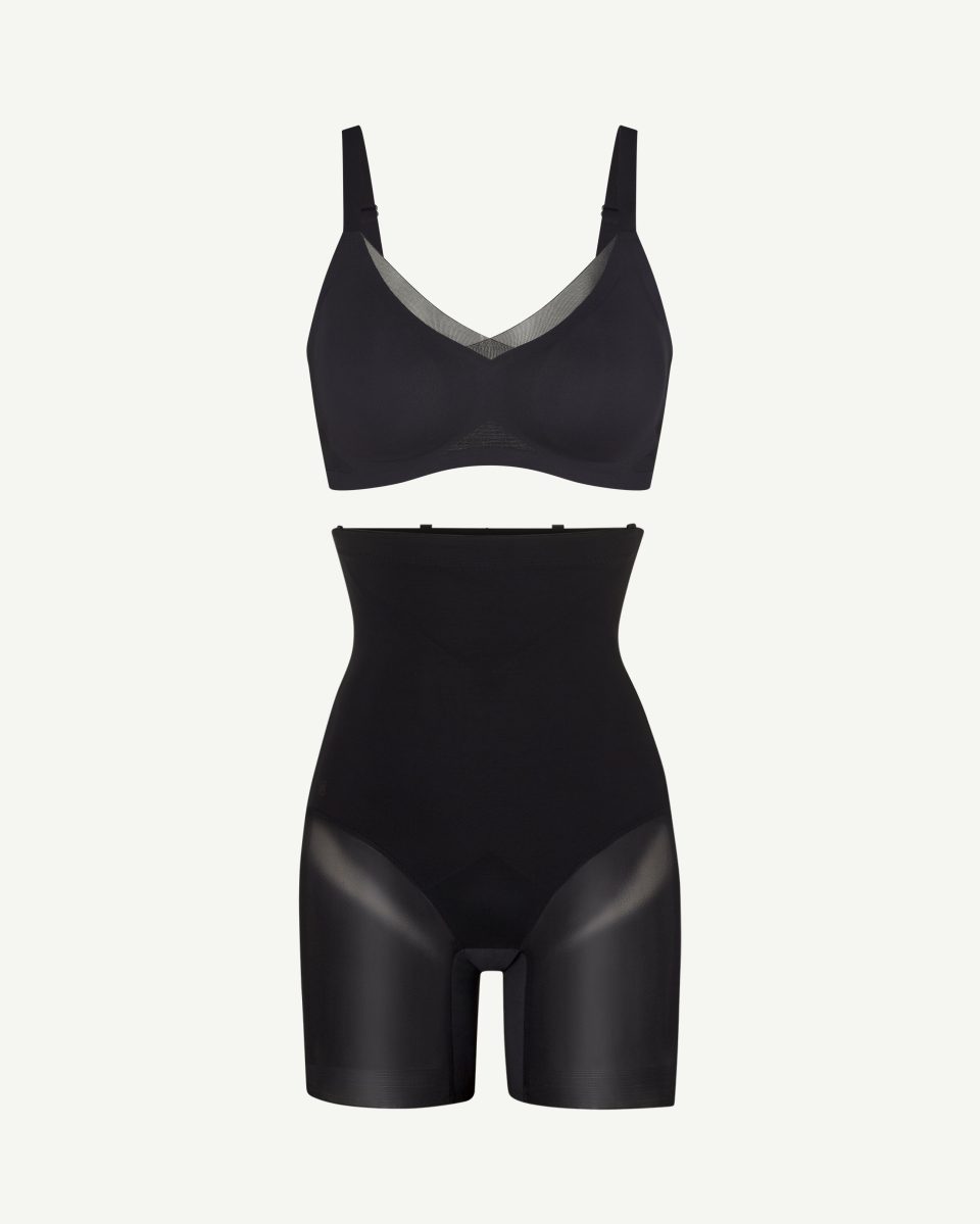 Extends below the bust for added coverage and support.
