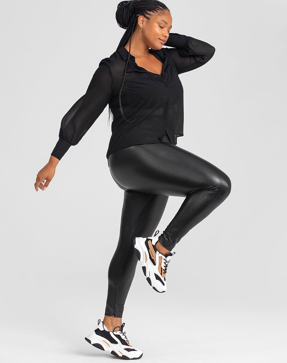 Luxe vegan leather looks real and unlike competitors. won’t rub off with wear. Built-in shaping. tailored stitching. and ankle zippers take these leggings to the next level. A 100% cotton gusset lets you skip the underwear.