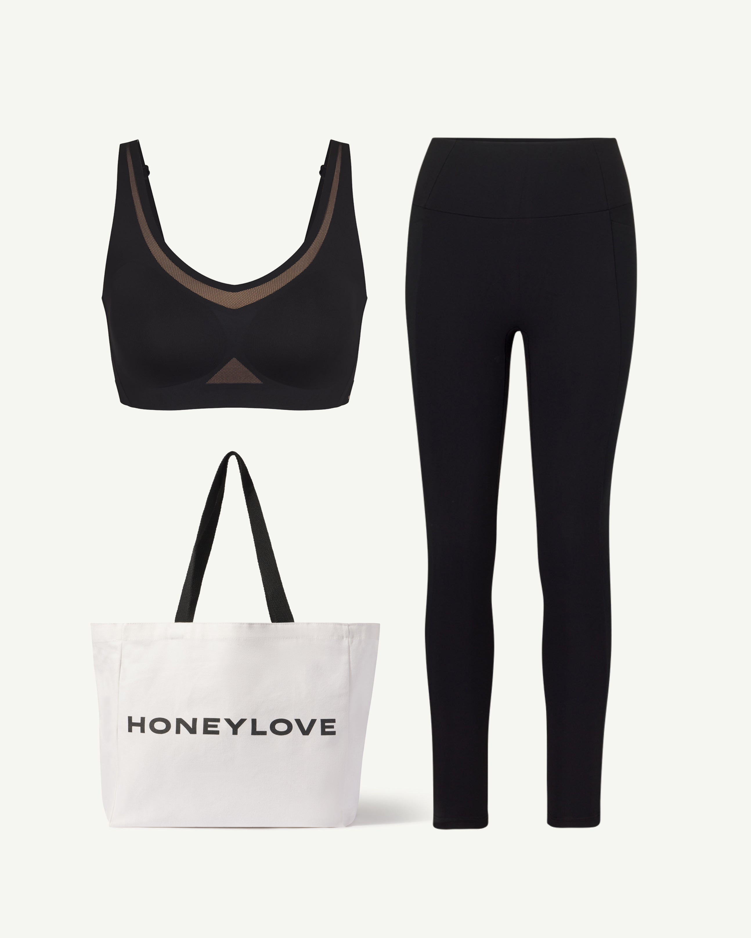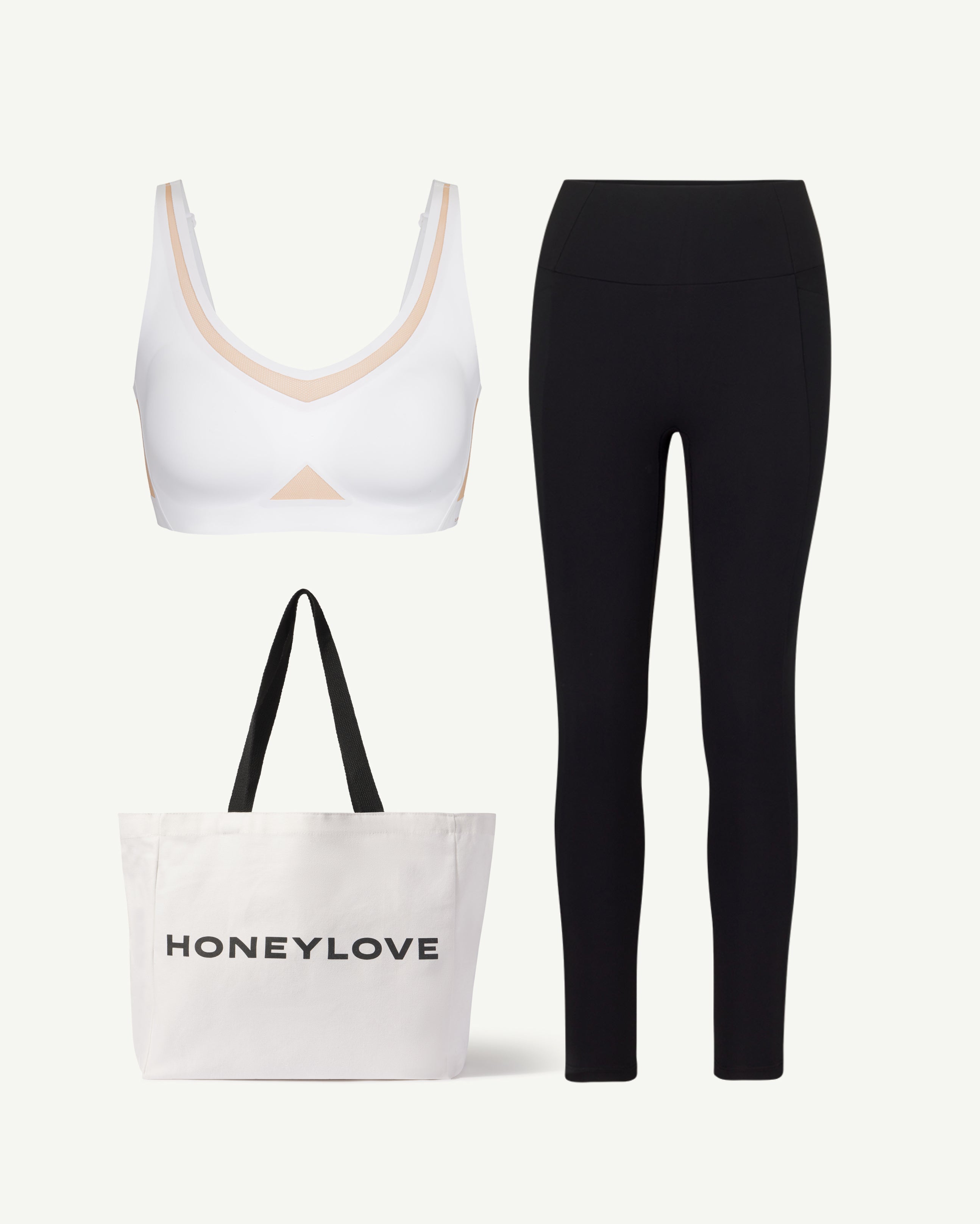 This bundle includes Honeylove’s CrossFlex Bra and InnerPower Legging. Purchase the Ready. Sweat. Go Bundle and save.