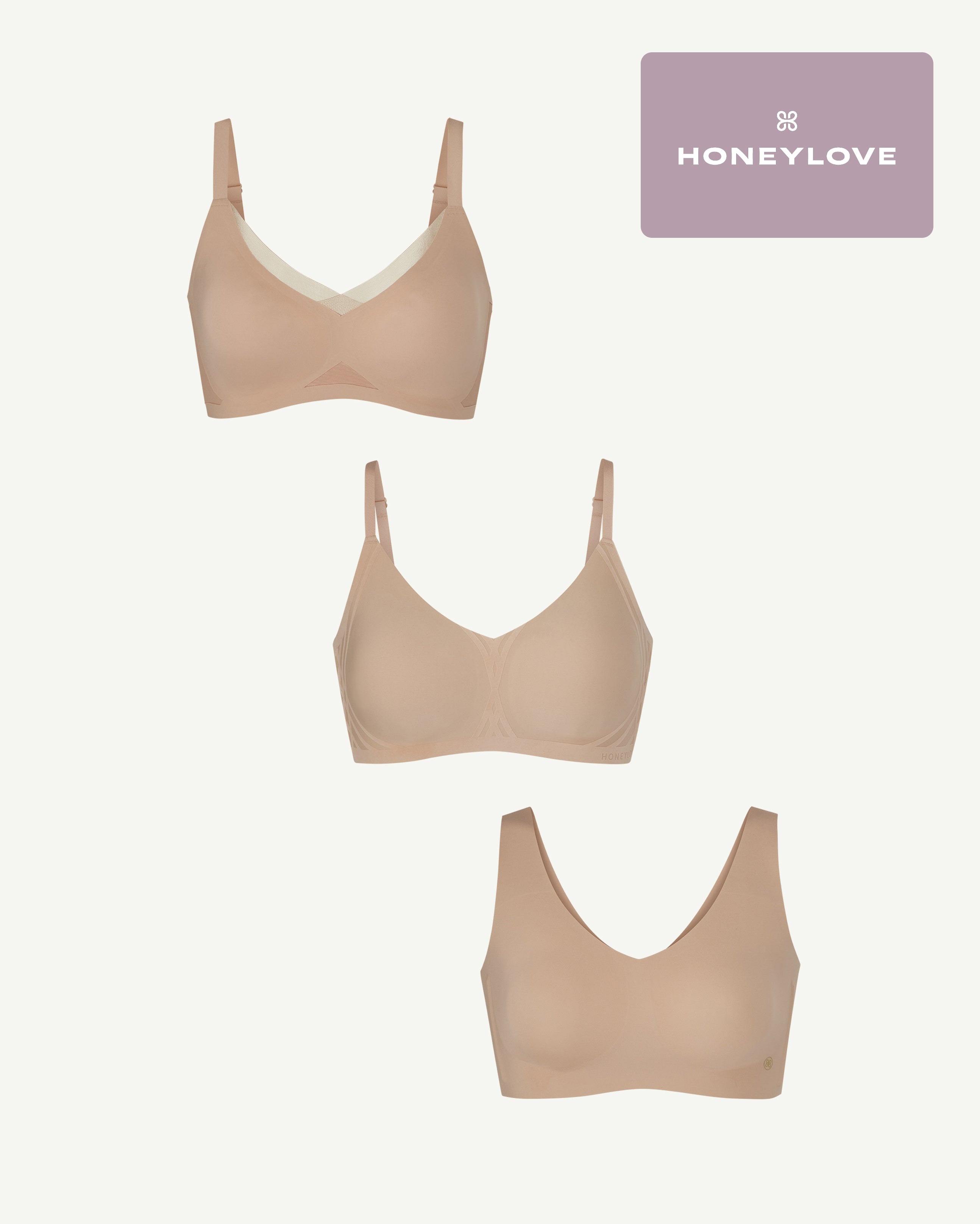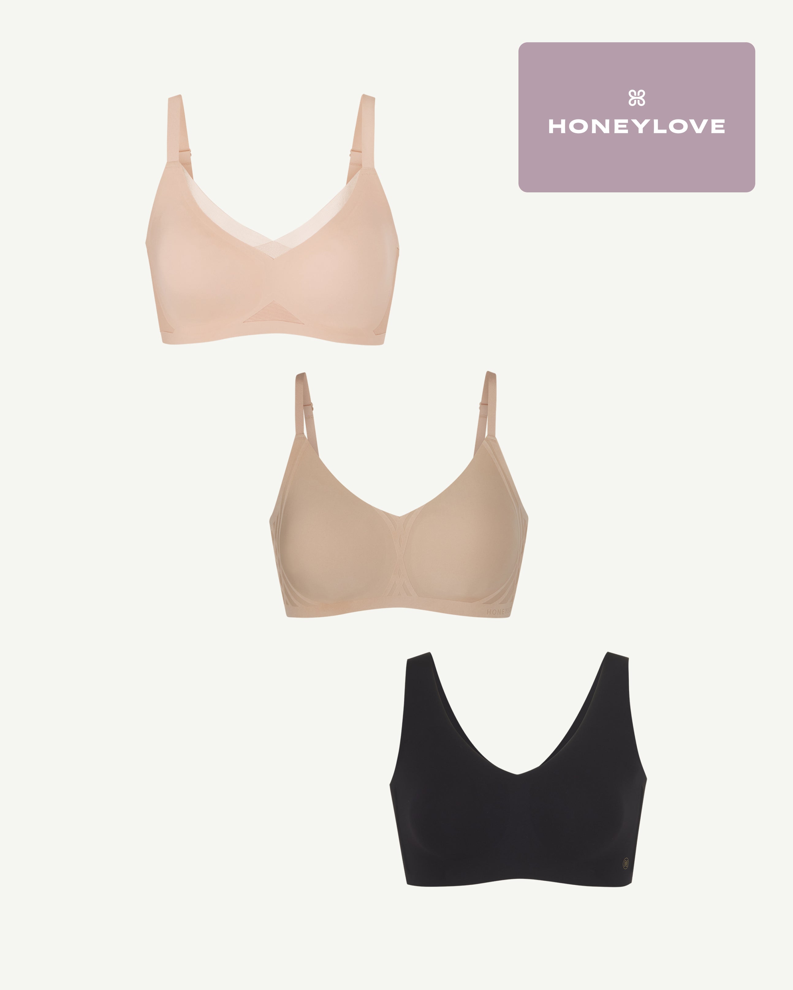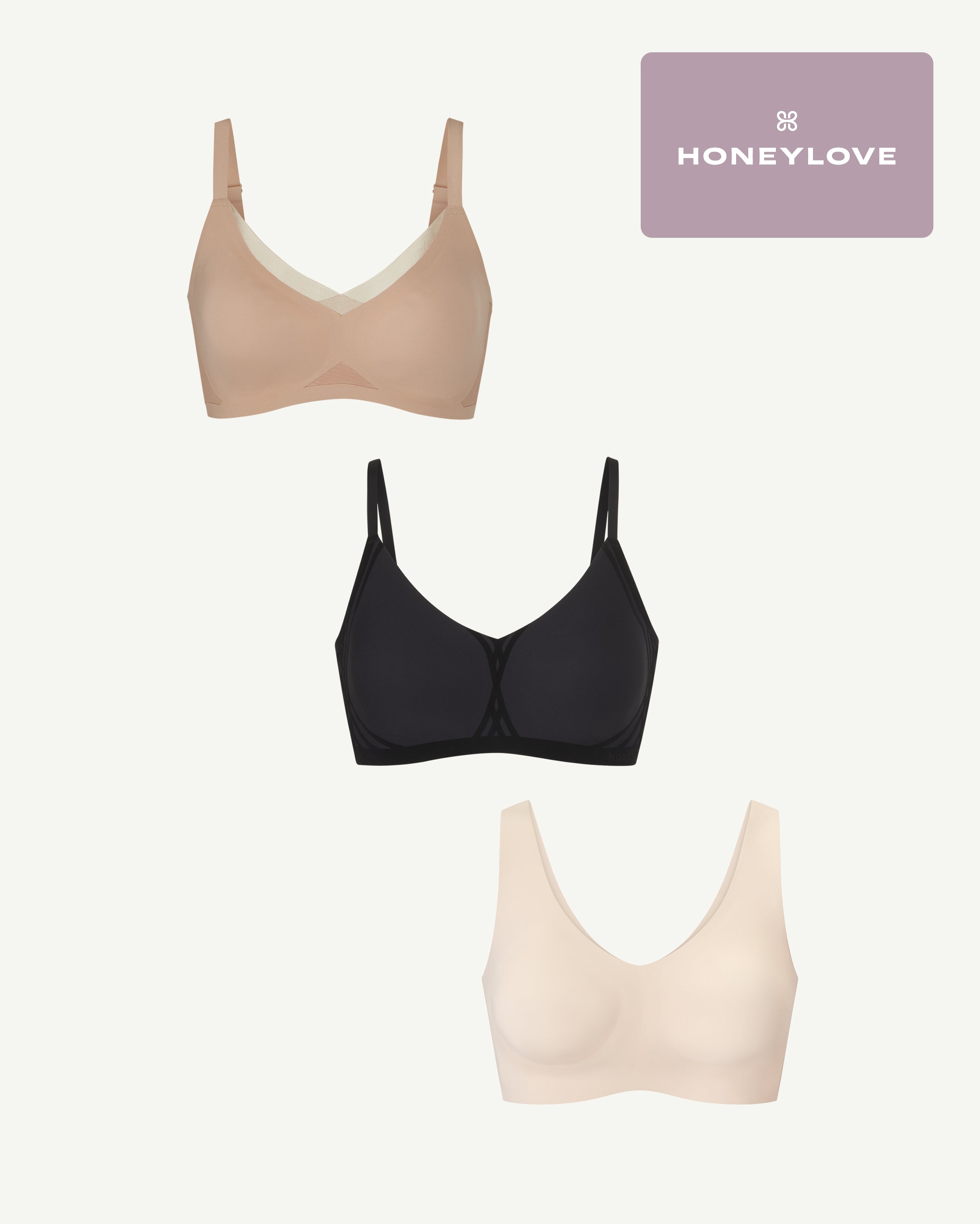 This bundle includes Honeylove’s CrossOver Bra. Silhouette Bra. SoftForm Bra. and Membership. Buy the Three Bra Bundle + Membership and save.